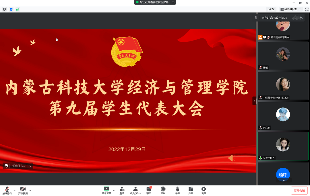 为积极联系学生、服务学生,实现学生干部队伍可持续发展,ok138cn太阳集团古天乐于2022年12月29日下午于线上召开第九届学生代表大会。8个代表团175名学生代表学院2019-2022级学子参会并行使权利。学团负责老师张雪薇、乌云塔娜参加会议。