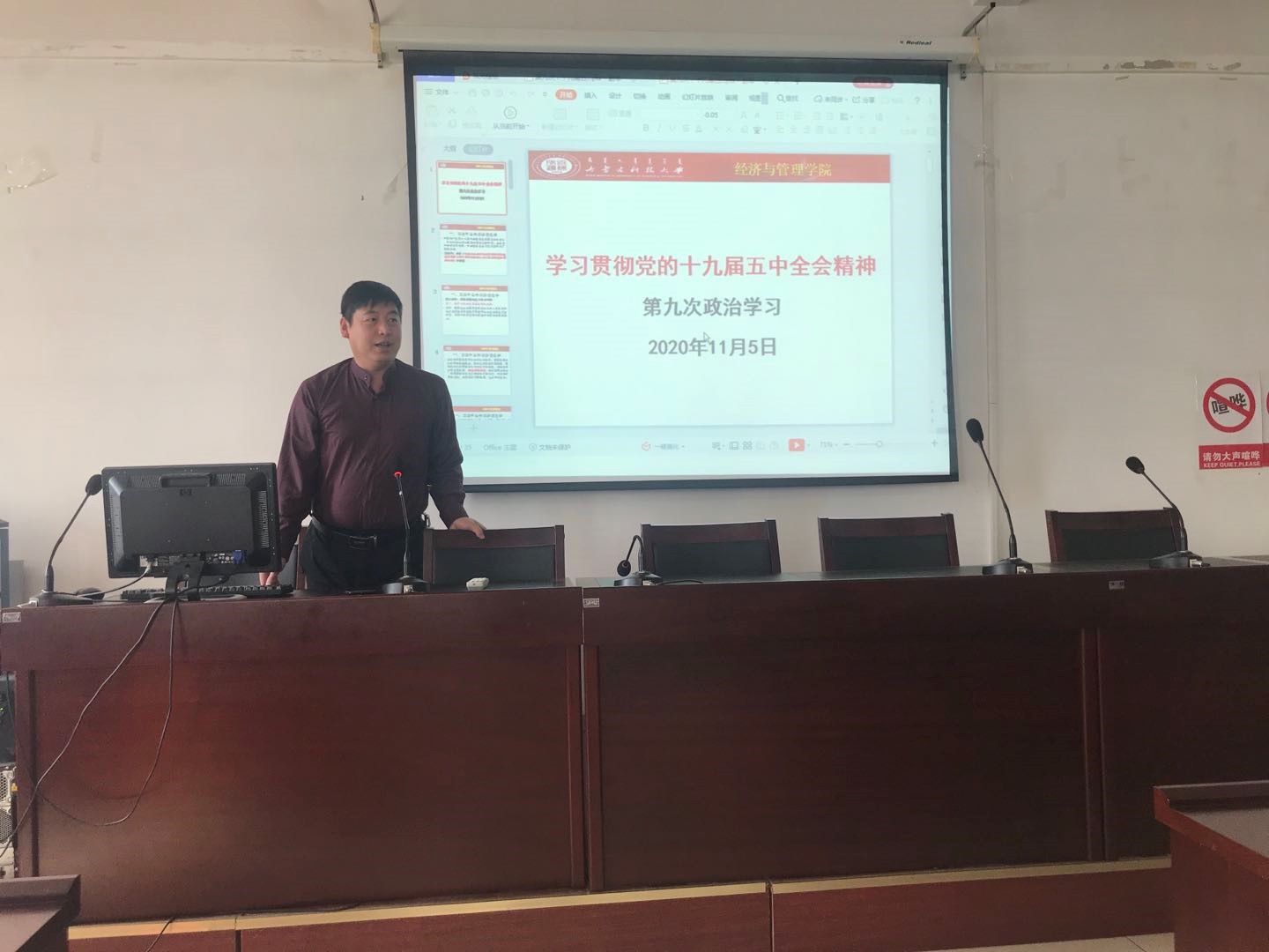 2020年11月5日,ok138cn太阳集团古天乐党总支组织了全体教师政治学习。党总支书记马广辉做了题为《学习贯彻党的十九届五中全会精神》的专题讲座。重点学习了习近平总书记的讲话:关于《中共中央关于制定国民经济和社会发展第十四个五年规划和二〇三五年远景目标的建议》的说明。