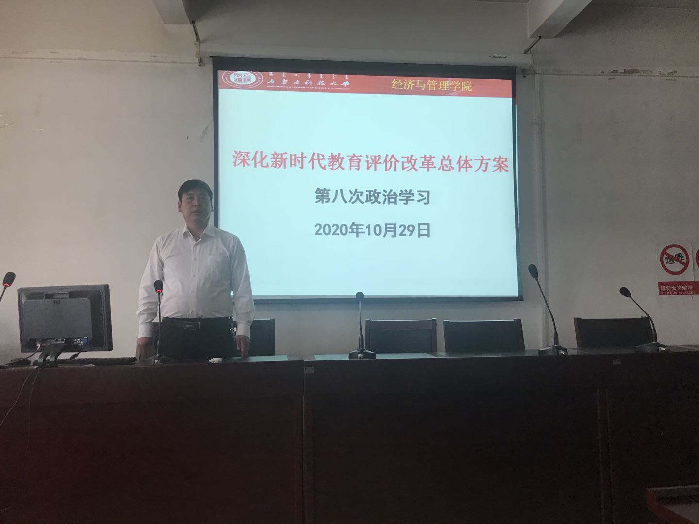 202010月中共中央、国务院印发了《深化新时代教育评价改革总体方案》,并发出通知,要求各地区各部门结合实际认真贯彻落实。会议学习了《深化新时代教育评价改革总体方案》的时代背景、总体要求、主要任务和组织落实等四个方面内容,重点学习了改进高等学校评价、改革教师评价、改革学生评价等三个内容。会议号召,全体教师认真学习中央文件精神,主动适应评价改革导向,牢记为党育人、为国育才使命,培养德智体美劳全面发展的社会主义建设者和接班人。