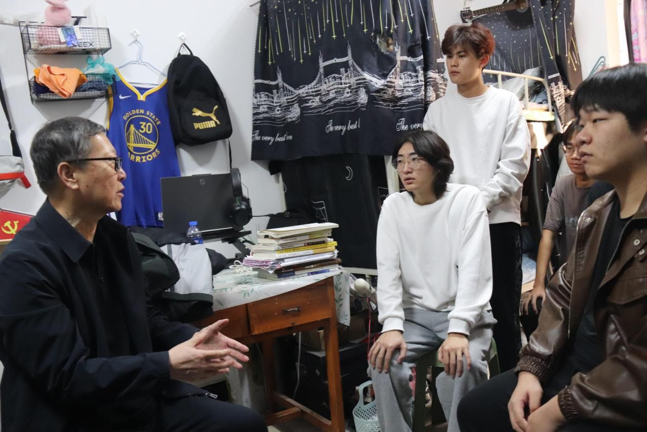 “家是哪里的?”“在学校吃得习惯吗?”“最近有没有看什么书?”杨建林走进23号楼127室,与同学们面对面亲切交流。他详细询问了同学们的学习生活情况,特别关注了大家在校的学习状态和身心健康。同时鼓励同学们规划好学习生活,主动学习使用新技术,多阅读课外书籍,关注校园和社会热点,增强安全防范意识。