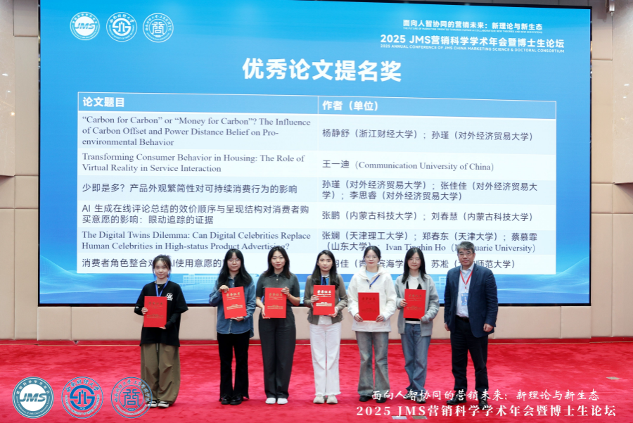 本届年会由国家自然科学基金委管理学部指导、《营销科学学报》主办、西南财经大学承办,中国高等院校市场学研究会等提供学术支持。会议以 “面向人智协同的营销未来:新理论与新生态” 为主题,紧扣 “人工智能+” 行动部署,汇聚了500余名国内外知名学者与业界精英,共话营销科学创新发展。在众多高水平论文中,我院成果脱颖而出,与来自对外经济贸易大学、天津大学、浙江财经大学等高校一同荣获优秀论文提名奖,充分彰显了研究的学术价值与专业认可度。