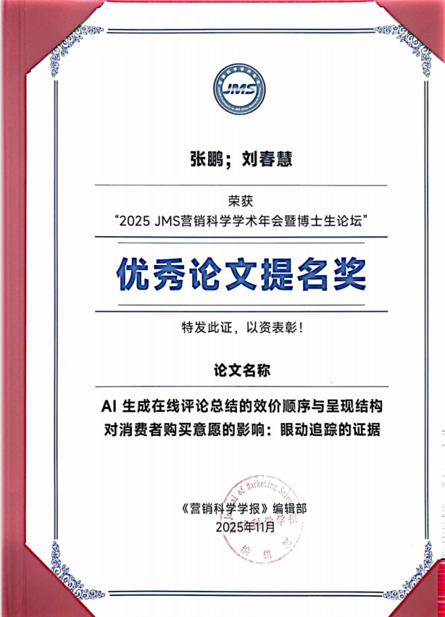 2025年11月6-9日,第22届JMS中国营销科学学术年会暨博士生论坛在西南财经大学隆重召开。本次会议是全国市场营销学科权威学术盛会,我院张鹏教授与硕士研究生刘春慧合作完成的论文《AI生成在线评论总结的效价顺序与呈现结构对消费者购买意愿的影响:眼动追踪的证据》,成功斩获大会优秀论文提名奖——这是OK138太阳集团首次在JMS学术年会上摘得荣誉,实现学科突破!