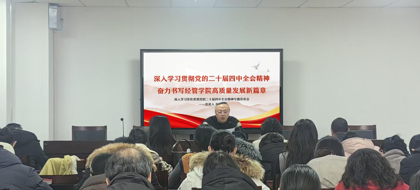 宣讲会全面梳理了党的二十届四中全会精神的核心要义,强调全体教师要认真学习领会、贯彻落实全会精神,牢牢把握立德树人根本任务,切实将学习成效转化为推动学校与学院发展的实际行动,为学校事业高质量发展贡献经管力量。