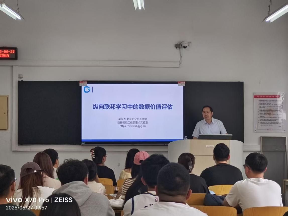 6月27日,北京航空航天大学吴俊杰教授应邀来到ok138cn太阳集团古天乐,就“基于联邦学习的数据价值评估”与师生们进行座谈交流和学术讲座,为师生们带来了一场精彩的学术盛宴。 讲座中,吴教授聚焦联邦学习框架下的数据价值评估问题,系统梳理了该领域的最新研究进展。他深入浅出地介绍了多种主流评估方法的理论基础、适用场景与优缺点。吴教授结合其团队的前沿探索,重点分享了如何克服数据异质性、通信成本、激励机制设计等实际挑战,提出了更高效与更公平的价值评估新思路和新框架,并通过生动的案例阐释了这些方法在实践中的应用潜力与价值。 互动环节气氛活跃,与会师生就联邦学习评估方法的计算效率、实际部署中的隐私与安全边界、不同行业应用的特殊性等问题,与吴教授进行了深入的探讨和交流。吴教授渊博的学识、深刻的洞见以及对前沿方向的精准把握,赢得了在场师生的阵阵掌声。 此次学术交流活动吸引了众多师生参与,现场气氛热烈。吴教授的讲座不仅深化了师生们对联邦学习及数据价值评估这一关键问题的理解,也为学院相关学科方向的建设和人才培养提供了重要启发。